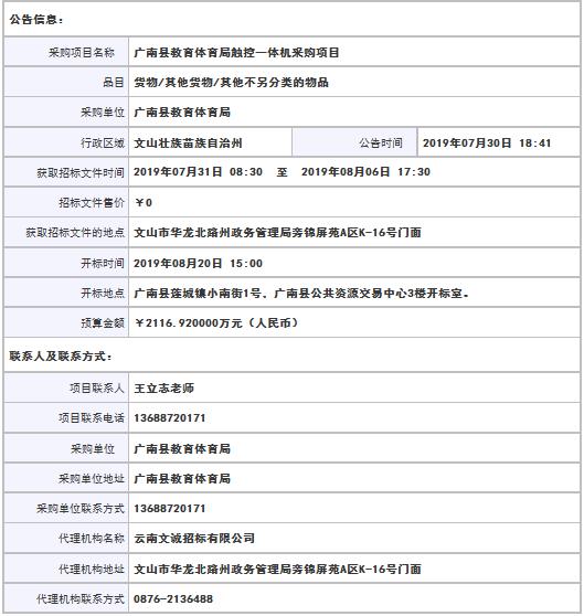 當前位置:數字標牌網 > 行業新聞 > 數字標牌招標信息 > 廣南縣教育體育局觸控一體機采購項目公開招標公告
