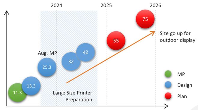 從產(chǎn)品尺寸來看,用于數(shù)字標(biāo)牌的電子紙膜片產(chǎn)品中,已經(jīng)量產(chǎn)和開發(fā)中的尺寸包括11.3、13.3、25.3、32、42寸等,未來三年內(nèi)將規(guī)劃更大的55寸和75寸。